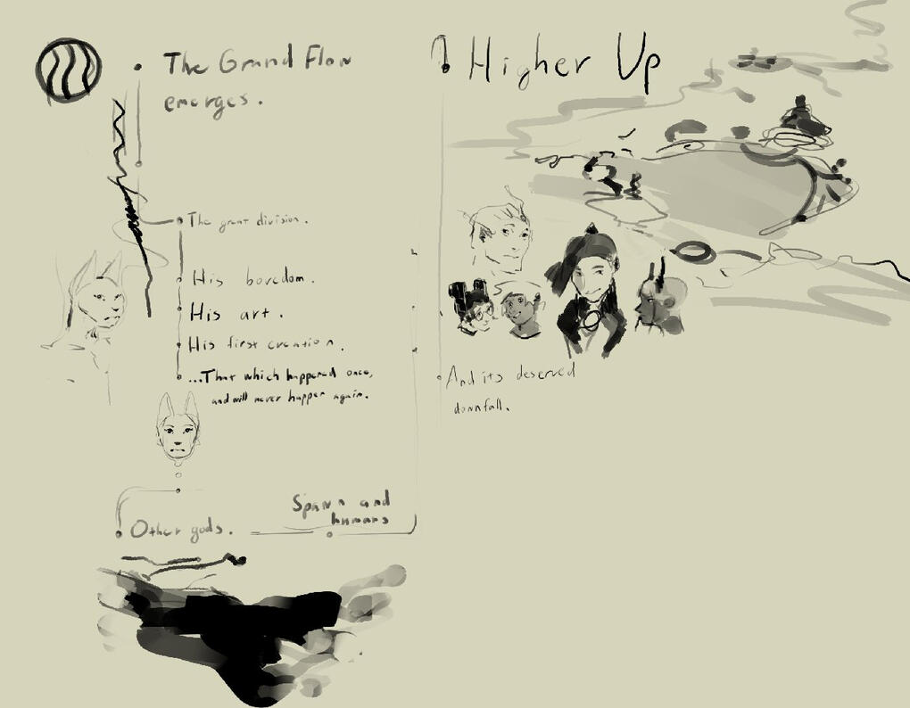 In the beginning, "The Grand Flow", the source of everything, is thought to have emerged out of nothing. It's a manifestation of constantly flowing energy, matter, and potential.In an indescribable world of nothing and everything, those three existed as abstract primal forces, until something changed in the matter realm.The flow of matter broke away, and formed a psyche of the first god, Zozo.The time of Zozo and other gods, who have broken away from the flow or Zozo himself, are scarcely documented. Known facts are that Zozo have lost a great deal of his raw power after a certain event, forming Jagullah in the process.